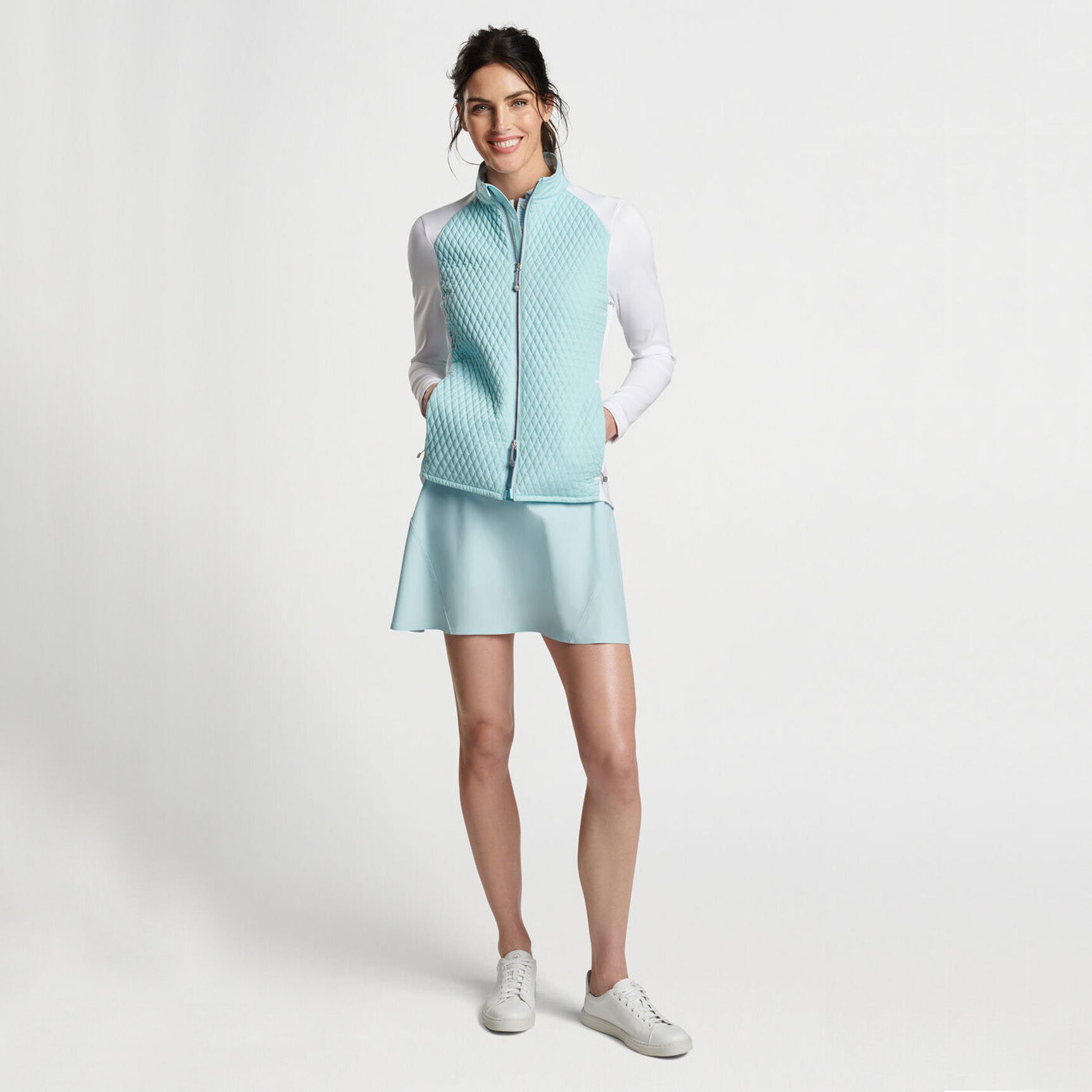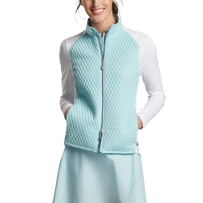Designed with an all-new look featuring a miniature diamond quilted pattern, this new twist on a trusted classic handles on and off course layering with ease. A lightly insulated front and back offer optimal warmth, while stretch shoulders and sleeves enhance a highly mobile, singularly stylish design.