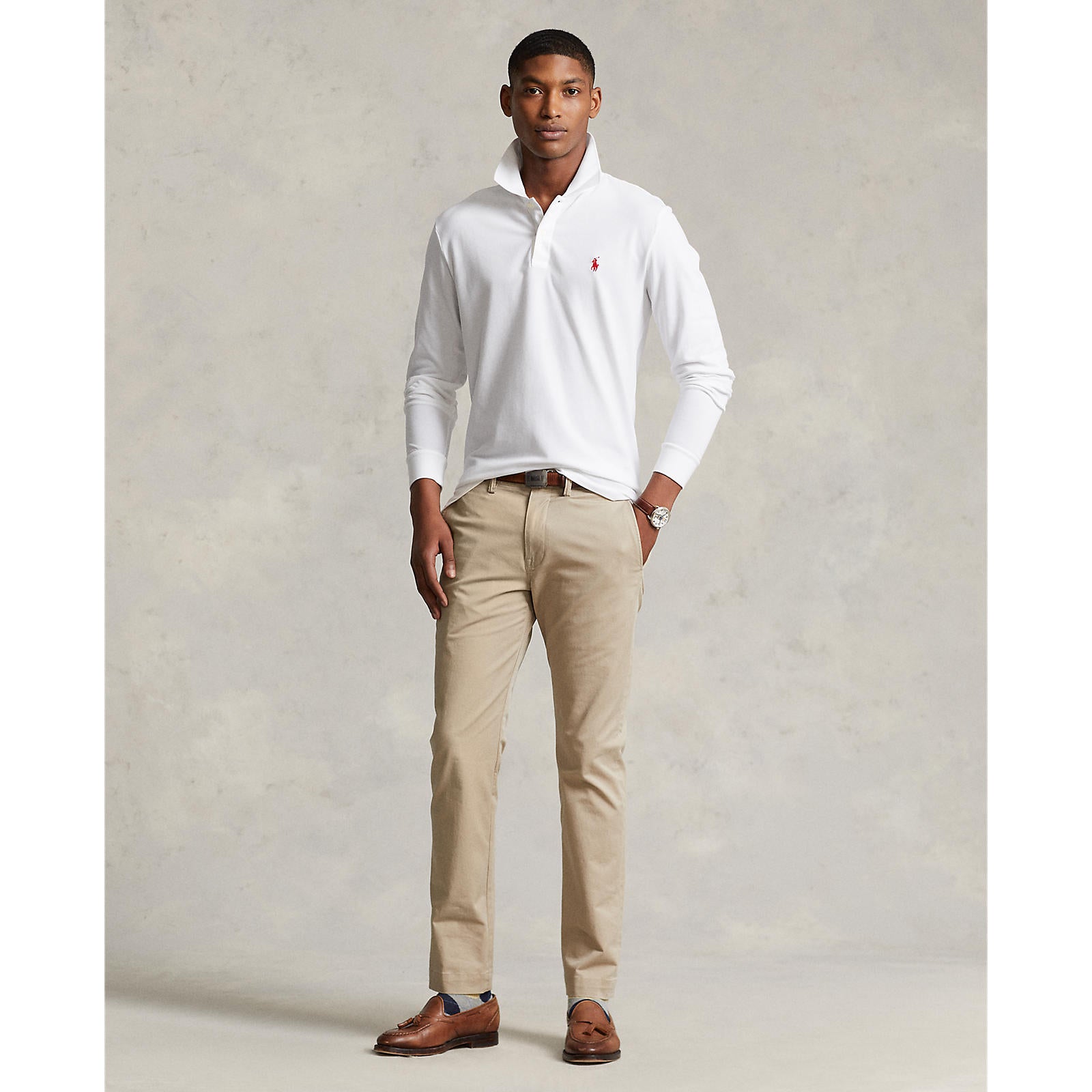 Ribbed Polo collar. Two-button placket. Long sleeves with ribbed cuffs. Even vented hem. Signature embroidered Pony at the left chest.