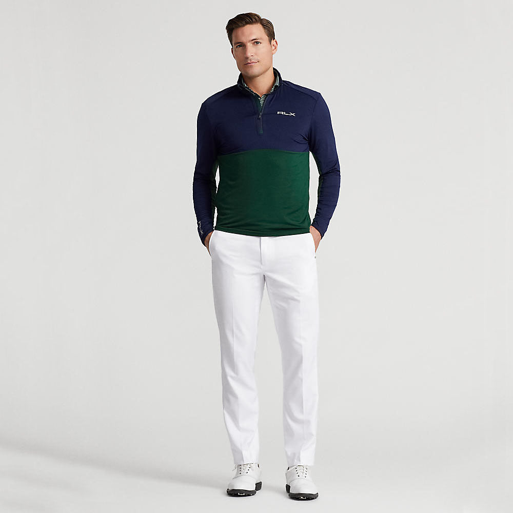 The RLX Ralph Lauren Peached Airflow Jersey 1/4 Zip is back for the 2024 autumn winter season, showcasing new color options. This mid-layer boasts a half-zip placket, elastic cuffs, and a stylish colorblock design. With its four-way stretch fabric, it offers optimal flexibility and unrestricted movement for peak performance. Designed with a slim fit, it has a modern and athletic appearance, seamlessly merging fashion and function. Complete with RLX branding on the front left chest, right sleeve, and back of the neck, this premium mid-layer is a must-have for any golfer's wardrobe.