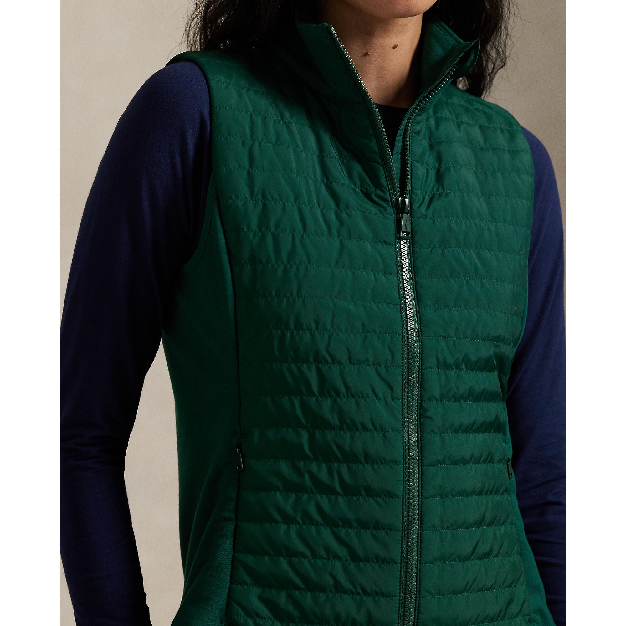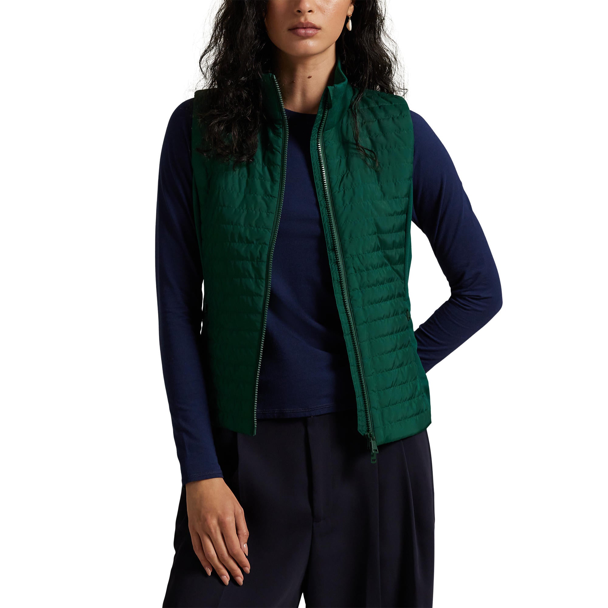 Lightweight, Technical, and Seamlessly Modern The RLX Ralph Lauren Women’s Hybrid Quilted Gilet blends sleek athletic styling with functional warmth. Designed with a lightly filled quilted front and a smooth French terry back panel, this slim-fit layer delivers the perfect balance of insulation and mobility. Finished with concealed zip pockets and bold RLX branding, it’s a versatile essential for cool mornings on the course or effortless layering off it.